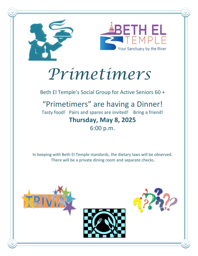 Please RSVP by Thursday, May 1. Contact the synagogue office for information on the dinner location and how to RSVP.